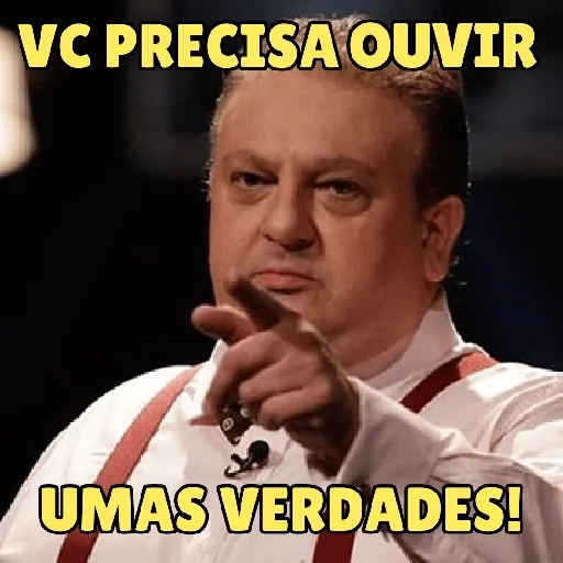 Homem de meia-idade com expressão séria, apontando o dedo indicador para o espectador. Ele veste uma camisa branca e suspensórios vermelhos. A imagem contém o texto 'VC PRECISA OUVIR UMAS VERDADES!' em amarelo.