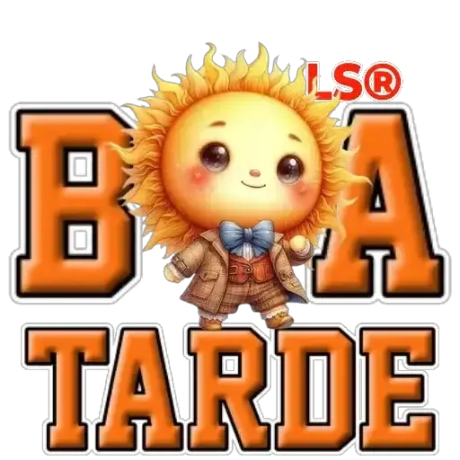 Um sol cartoon com expressão feliz e um casaco castanho, com as letras 'B A TARDE' em laranja.