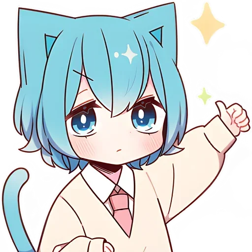 Garota de anime com cabelo azul e orelhas de gato, usando um suéter bege e gravata rosa, com estrelas brilhantes ao redor.
