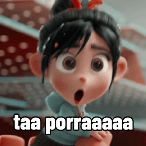 Menina de olhos arregalados e boca aberta, com expressão de surpresa ou choque. Ela está com um texto 'taa porraaaaa' sobreposto.