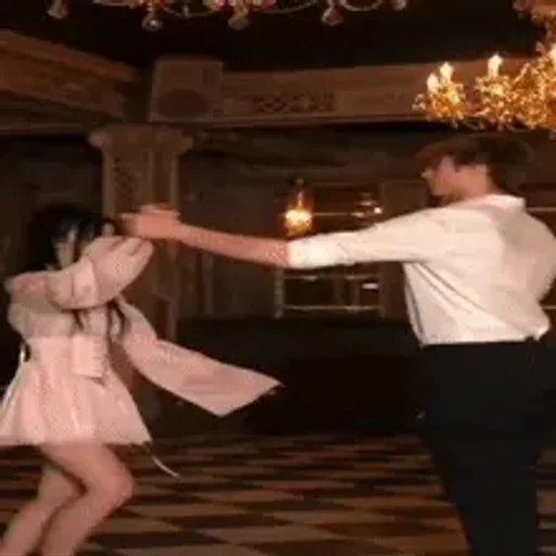 Um casal dançando em um ambiente com candelabro, o homem de camisa branca e calça preta, a mulher de vestido rosa.