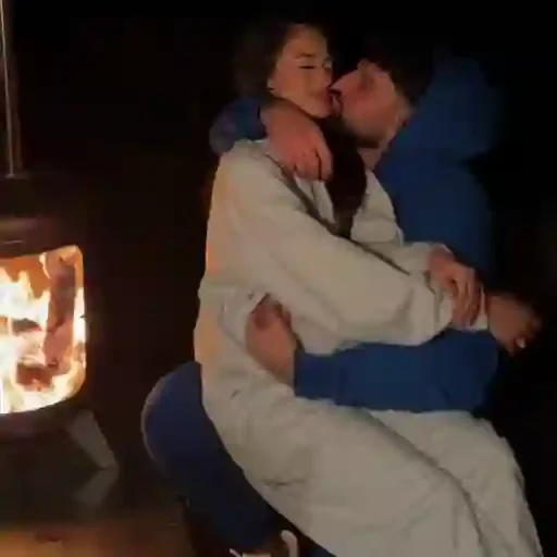Um casal se beija em frente a uma lareira acesa. Eles estão abraçados e sorrindo.