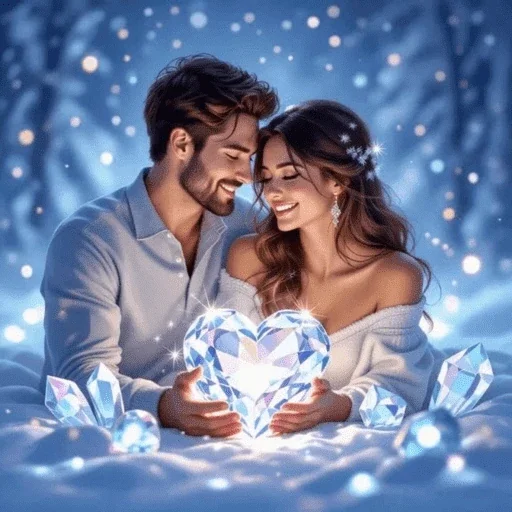 Um casal se beija enquanto segura um coração de diamante em um cenário de neve e luzes.