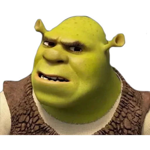 Rosto de Shrek com expressão séria e olhar lateral, vestindo uma camisa marrom.