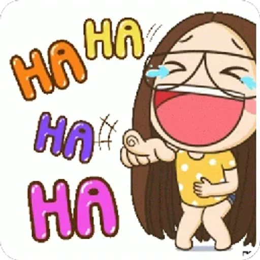 Uma menina de cabelo castanho ri alto com lágrimas nos olhos, vestindo uma blusa amarela. A imagem mostra 'HA HA HA HA' em letras coloridas.