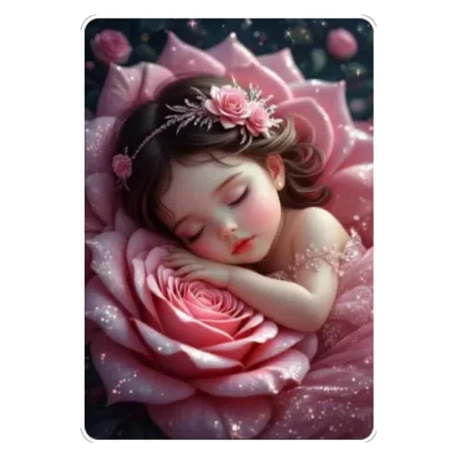 Menina fofa dormindo em uma rosa rosa grande com flor na cabeça.