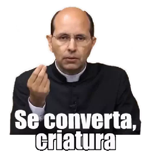 Um homem careca com um colarinho clerical, parecendo um padre, fazendo um gesto com a mão direita. Abaixo dele, está escrito 'Se converta, criatura'.