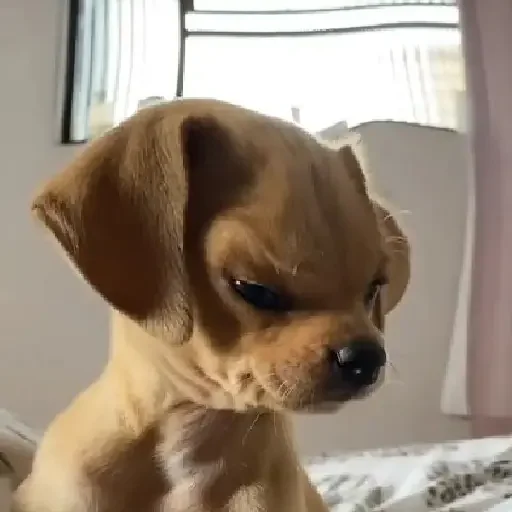 Um cachorro filhote com focinho preto e orelhas caídas, parecendo triste ou desapontado, em um ambiente com janela ao fundo.