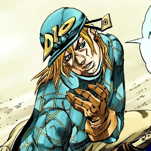 Personagem de anime com cabelo loiro e roupa azul, usando um boné com 'D.IO' em amarelo, fazendo um gesto com a mão.