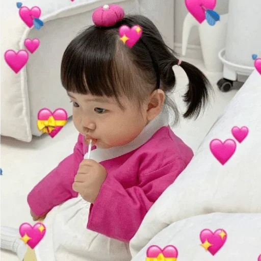 Menina pequena com franja e rabo de cavalo, vestindo uma blusa rosa, escovando os dentes com um creme dental, cercada de corações rosa e azuis.