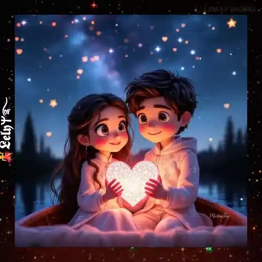 Um casal de anime fofinho, um menino e uma menina, sentados em uma nuvem sob estrelas, segurando um coração brilhante.