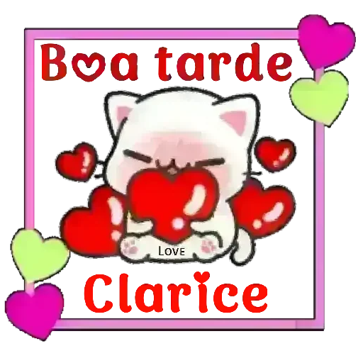 Um gato branco fofinho com corações vermelhos ao redor, olhos fechados e um coração grande na frente do rosto. O texto 'Boa tarde Clarice' está escrito em vermelho.