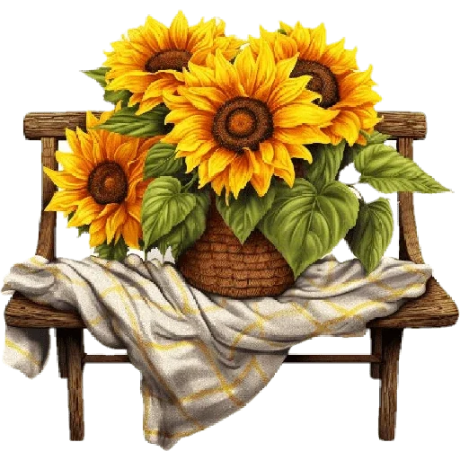 Um buquê de girassóis amarelos em um vaso de vime sobre uma cadeira de madeira com uma toalha xadrez.