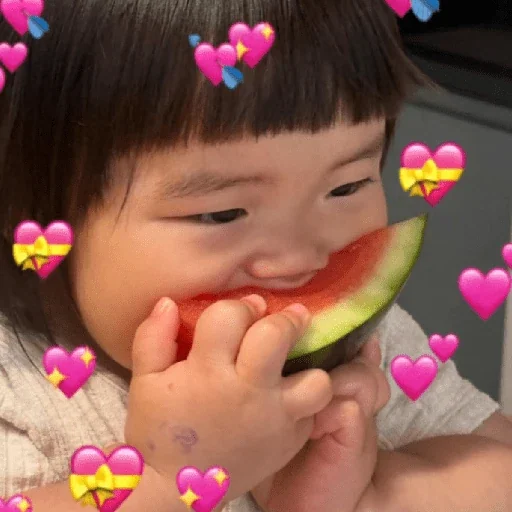 Menina com bangs comendo melancia, cercada de corações coloridos.