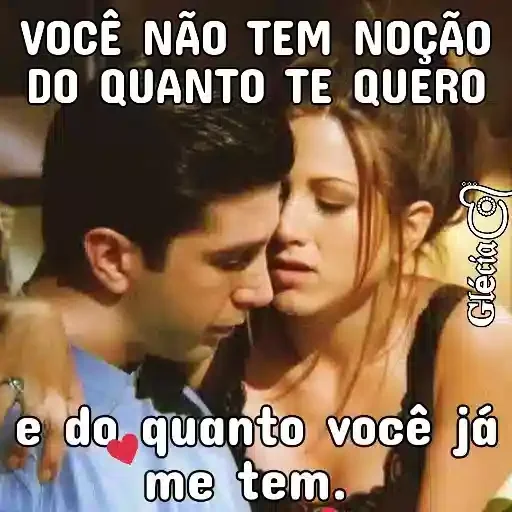 Um casal, com o homem ao lado esquerdo e a mulher ao lado direito, olhando para baixo. O homem tem cabelo preto e camisa azul, a mulher tem cabelo castanho e uma alça preta. Há um coração vermelho desenhado na camisa do homem. O texto 'VOCÊ NÃO TEM NOÇÃO DO QUANTO TE QUERO e do quanto você já me tem.' aparece em branco com contorno.
