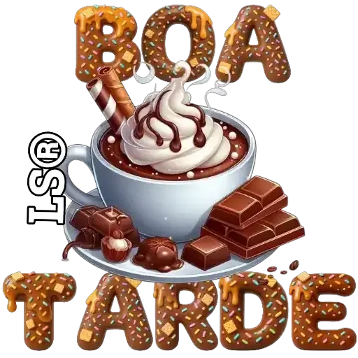 Uma xícara de café com chantilly e calda de chocolate, acompanhada de barras de chocolate e bombons. A imagem traz o texto 'BOA TARDE' em letras grandes e coloridas.