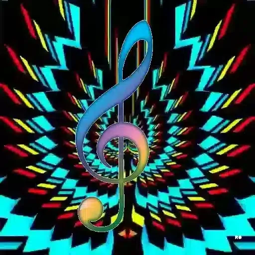 Um coração azul brilhante com uma clave de sol no centro, cercado de notas musicais coloridas e estrelas.