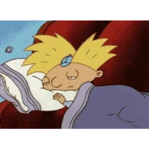 Personagem de desenho animado com cabelo amarelo e um olho azul adormecido em uma cama com cobertor roxo.