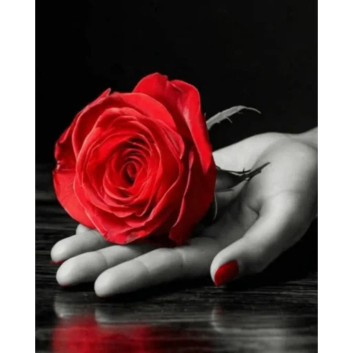 Uma mão com unha pintada de vermelho segurando uma rosa vermelha grande contra um fundo preto.