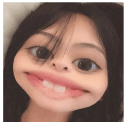 Rosto de uma menina com cabelos pretos e sorriso leve, mostrando os dentes.