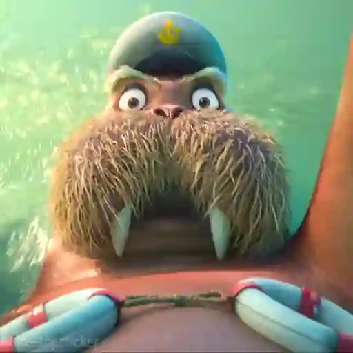 Um monstro marinho com pelos castanhos e olhos grandes, usando um boné azul com uma marca amarela, aparece com expressão surpresa ou assustada, com presas brancas e um colete salva-vidas ao fundo de uma cena subaquática.