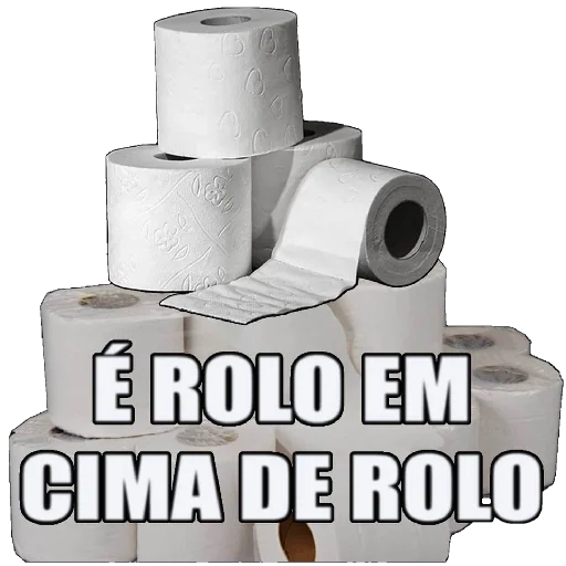 Quatro rolos de papel higiênico branco empilhados, com o texto 'É ROLO EM CIMA DE ROLO' em preto.