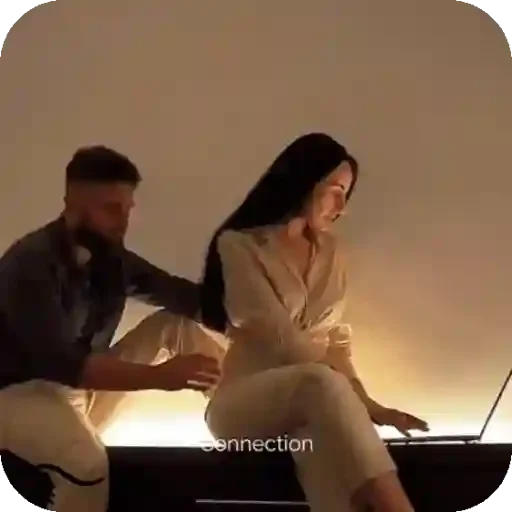 Um homem e uma mulher sentados em uma bancada, olhando para um laptop. O homem está ao lado da mulher, com a mão estendida.