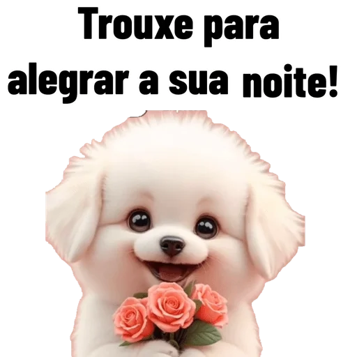 Um cachorro branco fofinho com flores rosa na boca e o texto 'TrouXe para alegrar a sua noite!'
