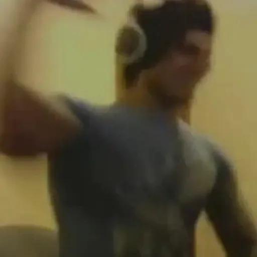 Homem com fones de ouvido e camiseta cinza, com o braço levantado, em um fundo amarelo.