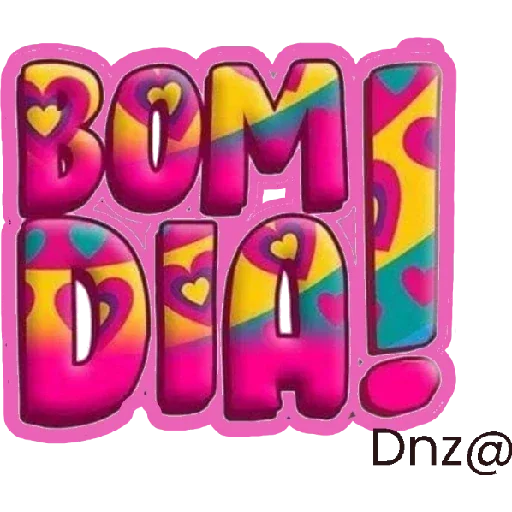 Um sticker colorido com a frase 'BOM DIA!' em letras grandes e decoradas com corações e padrões multicolores.