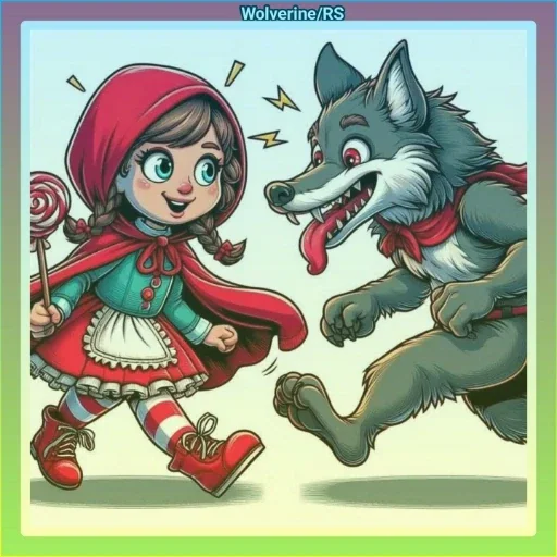 Uma menina vestida de Caperuzinho Vermelho, com uma capa vermelha e um chapéu, foge de um lobo cinzento com a língua para fora e expressão assustadora.
