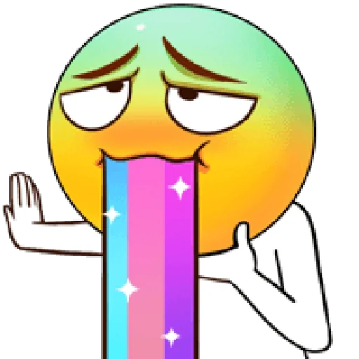 Um emoji amarelo com expressão de desaprovação, vomitando uma faixa colorida com estrelas. A faixa é azul, rosa e roxa.