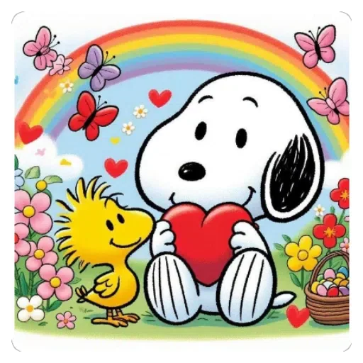 Snoopy e Woodstock sentados em um jardim com flores, borboletas e um arco-íris, Snoopy segurando um coração vermelho.