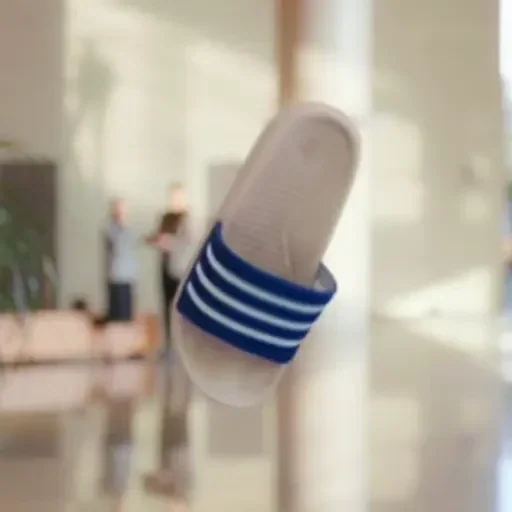 Um chinelo de borracha branco com pulseira de faixas azuis e brancas.