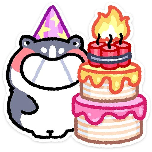 Um desenho de um animal cinza e branco com uma expressão feliz ao lado de um bolo de aniversário com velas acesas e chamas.