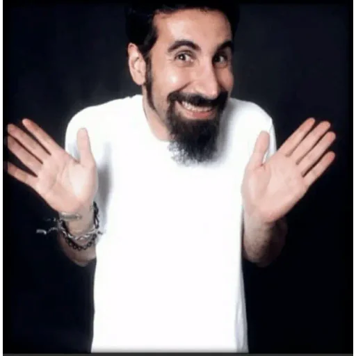 Homem com barba e bigode, vestindo uma camisa branca, com as mãos levantadas em gesto de surpresa ou dúvida, contra um fundo preto.