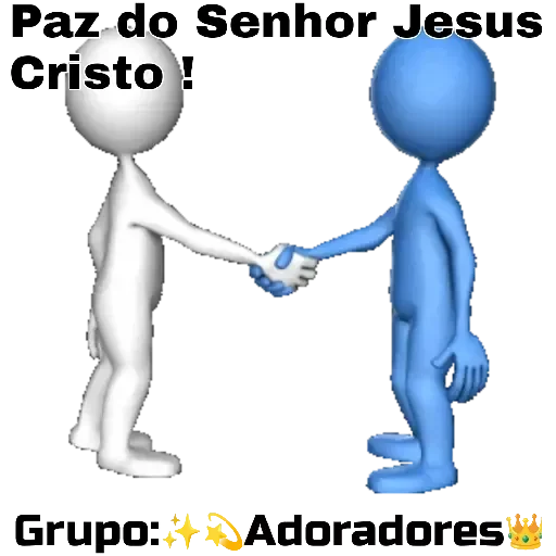 Dois personagens de desenho animado, um branco e um azul, apertando as mãos. 'Paz do Senhor Jesus Cristo!' e 'Grupo: Adoradores' são escritos em preto.