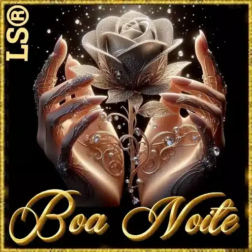 Mãos com unhas longas e decoradas com joias e filigranas segurando uma rosa prateada com o texto 'Boa Noite' em ouro.