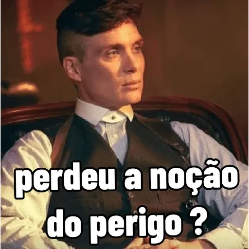 Um homem com cabelo preto e um bigode fino, vestido com uma camisa branca e um colete marrom, olha para o lado com uma expressão séria. Ele está sentado em uma cadeira e ao fundo há uma parede escura. A frase 'perdeu a noção do perigo?' aparece em texto branco na parte inferior.