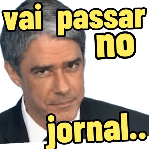 Um homem de meia-idade com cabelo grisalho e olhar sério, vestindo um blazer preto e uma camisa branca, com a frase 'vai passar no jornal..' em letras amarelas.