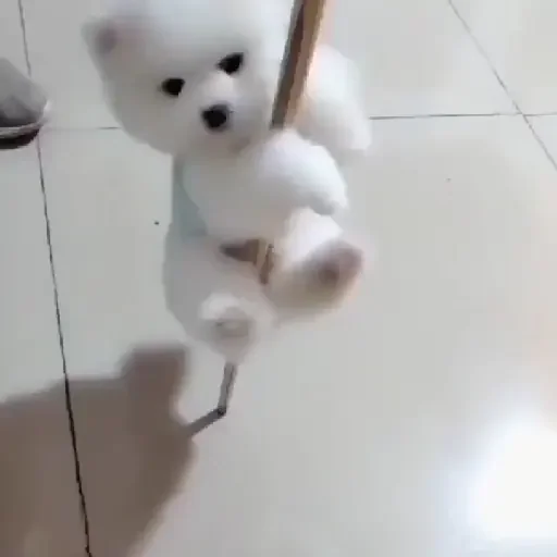 Um cachorro branco fofo está pendurado em uma corda, olhando para a câmera com olhos pretos e focinho preto.