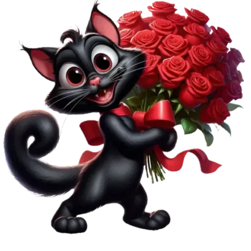 Um gato preto cartoon com olhos grandes e orelhas rosadas, carregando um buquê de rosas vermelhas com um laço vermelho.