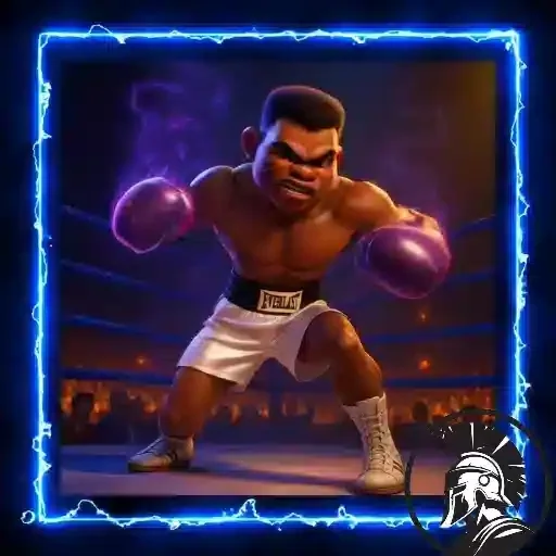 Um boxeur com shorts brancos e luvas roxas está em posição de luta, com um fundo de ringue de boxe e uma borda azul neon. O boxeur tem um olhar determinado.