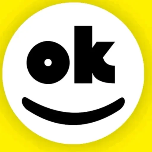 Um rosto sorridente com o texto 'ok' em preto sobre um fundo branco e amarelo.