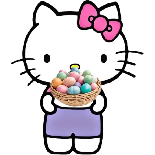 Rosto de Hello Kitty com um laço rosa, fazendo um gesto com a mão e com dois triângulos rosas atrás da cabeça.