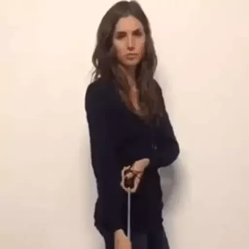 Mulher com cabelo castanho e blusa preta, parecendo confusa ou surpresa, com uma expressão facial neutra e um objeto na mão.