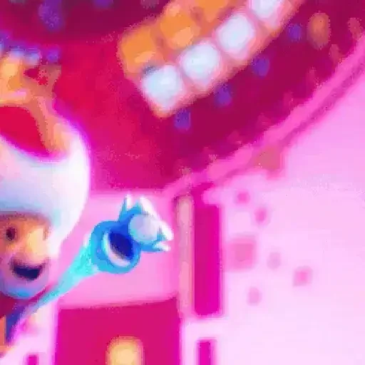 Personagem de anime com cabelo branco dançando em ambiente rosa com luzes azuis.