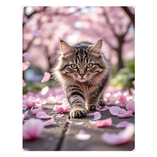 Gato marrom com manchas escuras andando em direção à câmera em um caminho coberto de pétalas de flores rosa, com árvores floridas ao fundo.