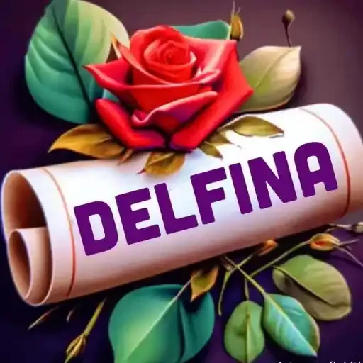 Uma rosa vermelha e folhas verdes ao lado de um pergaminho com o nome 'DELFINA' em letras roxas.
