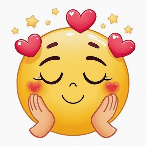 Um emoji amarelo com olhos fechados e sorriso, mãos ao lado do rosto, rodeado de corações vermelhos e estrelas amarelas.